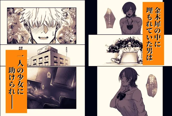 金木犀の茂みに“埋められてる男”に、通りがかった女の子が声をかける……って導入から、もう匂いまで想像させに来るのズルい。しかも「金木犀の香り」と「“女の子”の香り」を並走させるタイプで、空気がねっとり甘い……。今日ちょうど帰り道に金木犀の香りがして、頭の片隅がこの作品に引っ張られてるの、我ながらチョロいです。