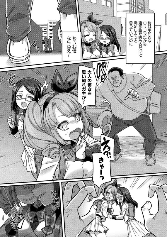 無職で人生詰み気味のおじさんが、たまたま揉め事を起こした“美少女2人”にバカにされ、勢いで路上へ追いかけてしまう……という導入から始まるんだけど、もうこの時点で胸がざらっとする。しかも辿り着いたのは少女のひとりの豪華な部屋で、突然ロ〇アの薬を飲まされて少女化。いや、少女化というか「メ○ガキ化」の方向に極端に寄っていくのが怖いのよ……。