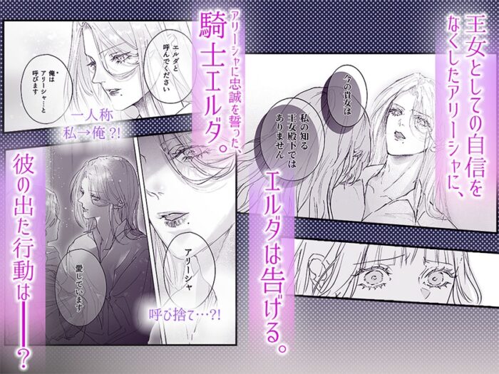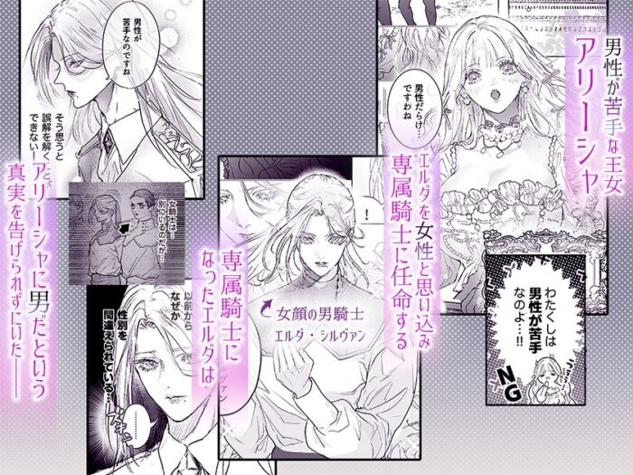 まず設定が強い。男性が苦手な王女アリーシャが、見た目が女っぽい(女顔)騎士のエルダを「女性だ」と思い込んで、専属騎士に任命しちゃうところから始まるのね。主従+身分差+誤解、ここまで揃ったらもう“事故”の匂いしかしない……。