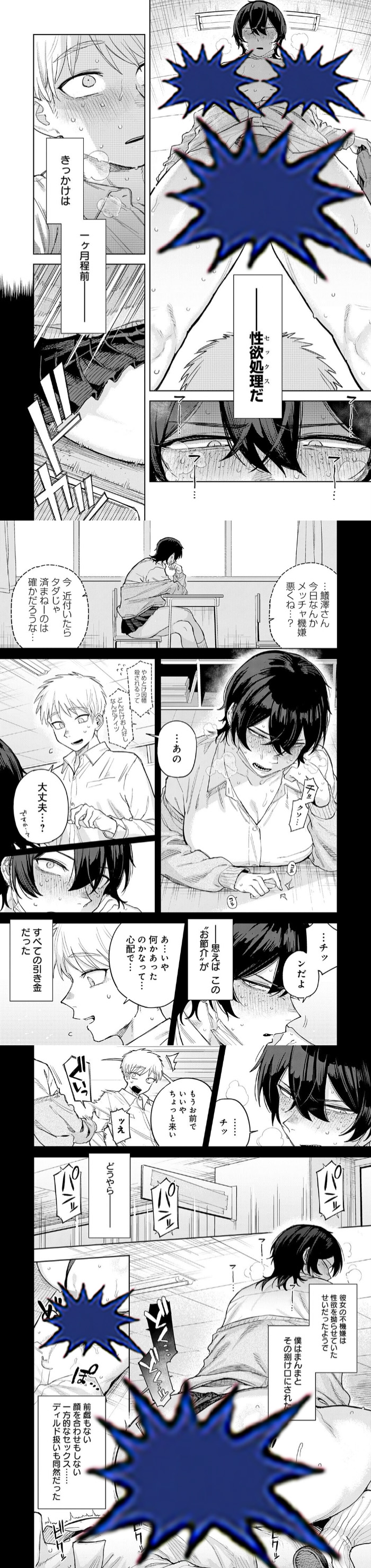 ある日を境に、主人公は蟻澤さんの“性欲処理係”として扱われるようになります。基本は一方的で、会話も少なく、ただ命令されて従うだけの関係。