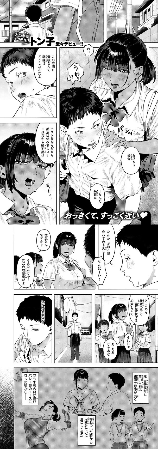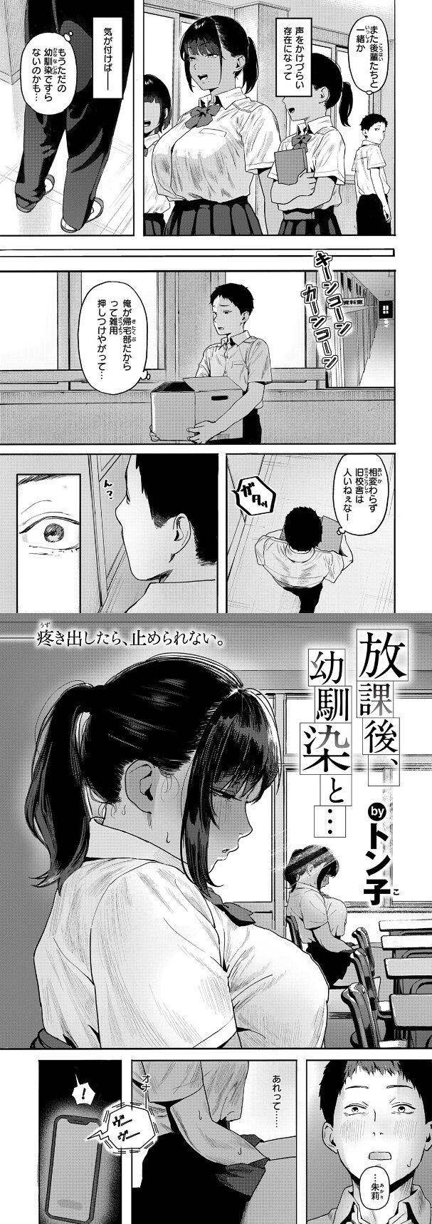 優介(ゆうすけ)と朱莉(あかり)は、家同士も近い“幼馴染”として当たり前みたいに一緒に育ってきた関係。ところが朱莉がバレー部のエースと付き合いだしてから、ふたりの距離がじわっと開いていきます。優介は気になってるのに踏み込めない、あのもどかしさがね…刺さる。そんな放課後、教室で朱莉がひとりでしている場面を優介が目撃してしまい、状況が一気にひっくり返る。いや待って、ひっくり返るというか「見ちゃった側が終わる」やつ。気づかれた優介は逃げるように帰宅するけど、朱莉は追いかけるみたいに家まで来て、部屋でくつろぐように距離を詰めてくる…という流れです。今日ちょうど学校帰りの空気を思い出す用事があって、読みながら胸の奥が妙にざわつきました。