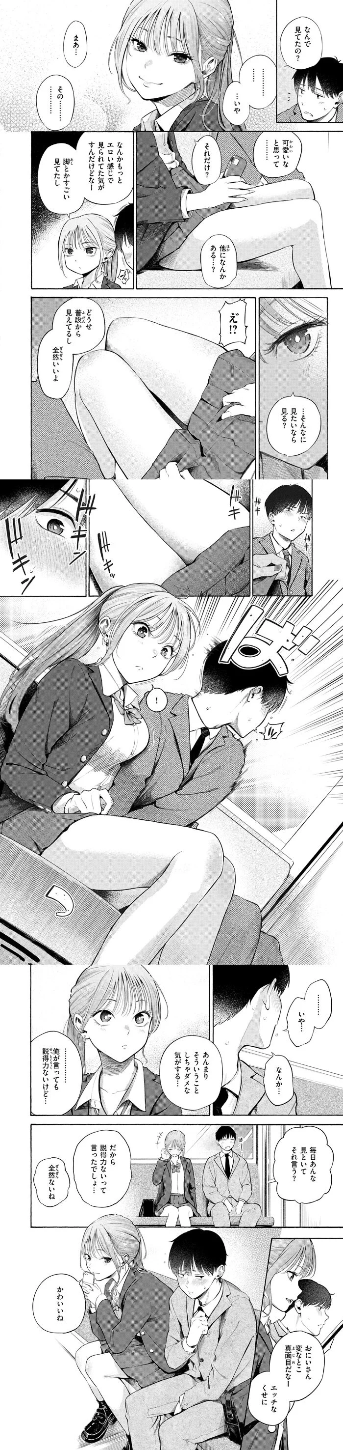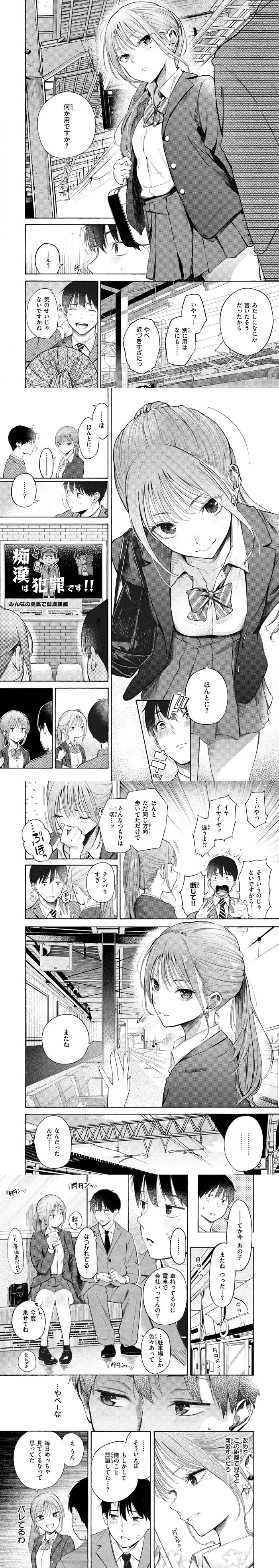 舞台は通学時間帯の電車内。制服姿の女子と、スーツ姿の社会人男性が隣り合って座る、ただそれだけの状況から物語は始まります。