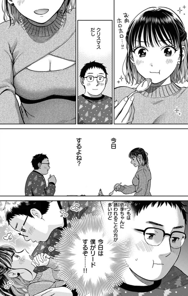 舞台はクリスマス。非モテ系男子の大吉太(ひとしだいき)と、彼女の市川依李子(いちかわよりこ)が「新米カップルとして初めての聖夜」を迎えるところから始まります。いつもは依李子に流されがちな大吉太が、今回は自分がリードするって決めるんだけど、これがまた思うようにいかない。いや待って、リードって気合じゃなくて“空気の作り方”だもんね。そんな中で彼女から、初めての(生)のお誘いが飛んできて……という流れ。