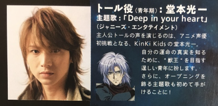 2006年のアニメ「獣王星」で、堂本光一は主人公・トール(青年期)の声を担当しました。作品の雰囲気に合わせて、主題歌「Deep in your heart」も自ら作曲し、キャラクターと音楽が一体となった表現に挑んでいます。