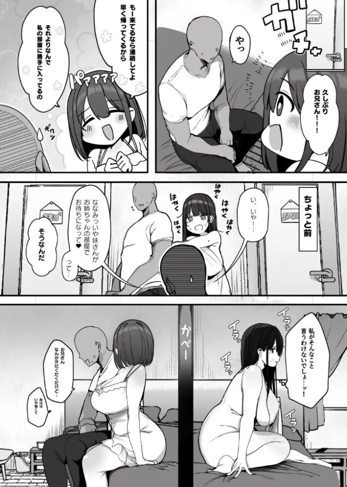 物語は数年ぶりに再会した爆乳姉妹・つばさとみおが、主人公に「お兄さん…溜まってませんか?」と迫る場面から始まります。